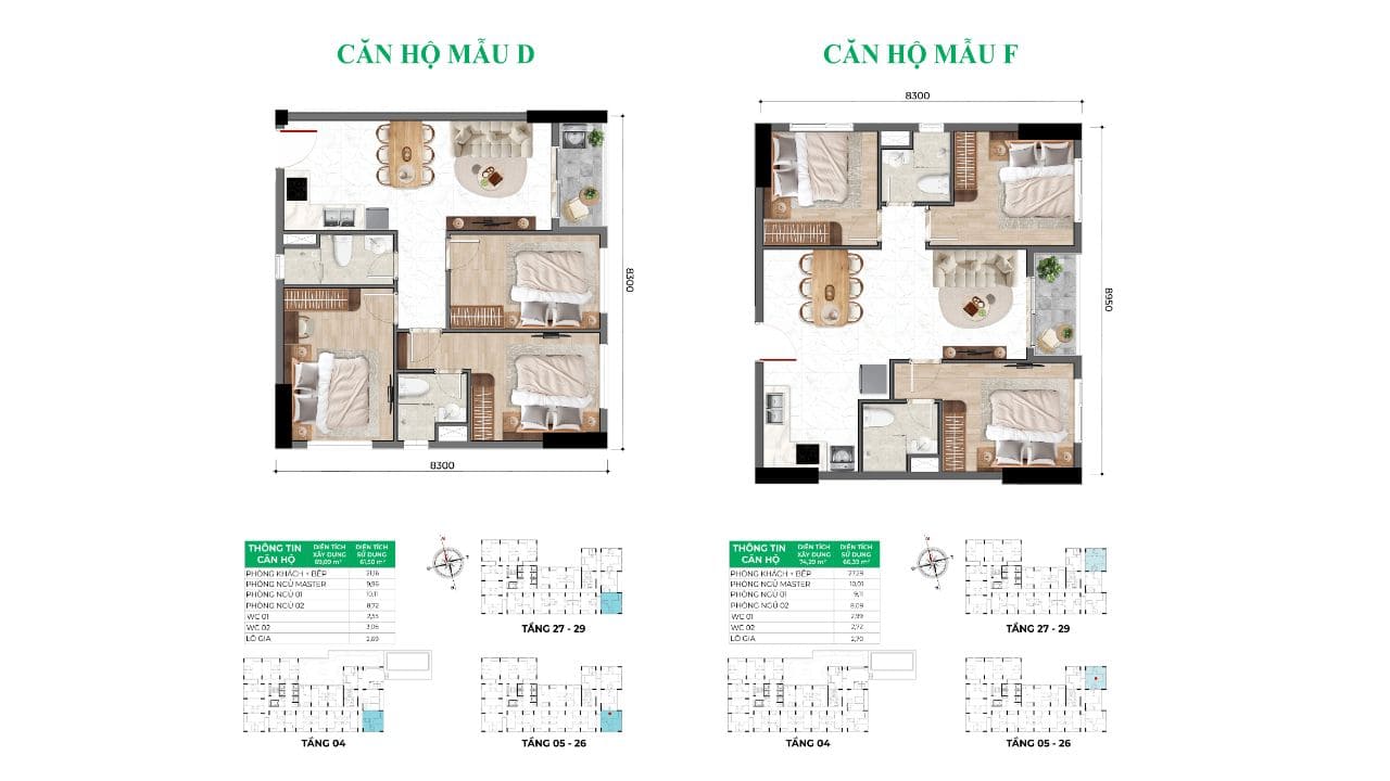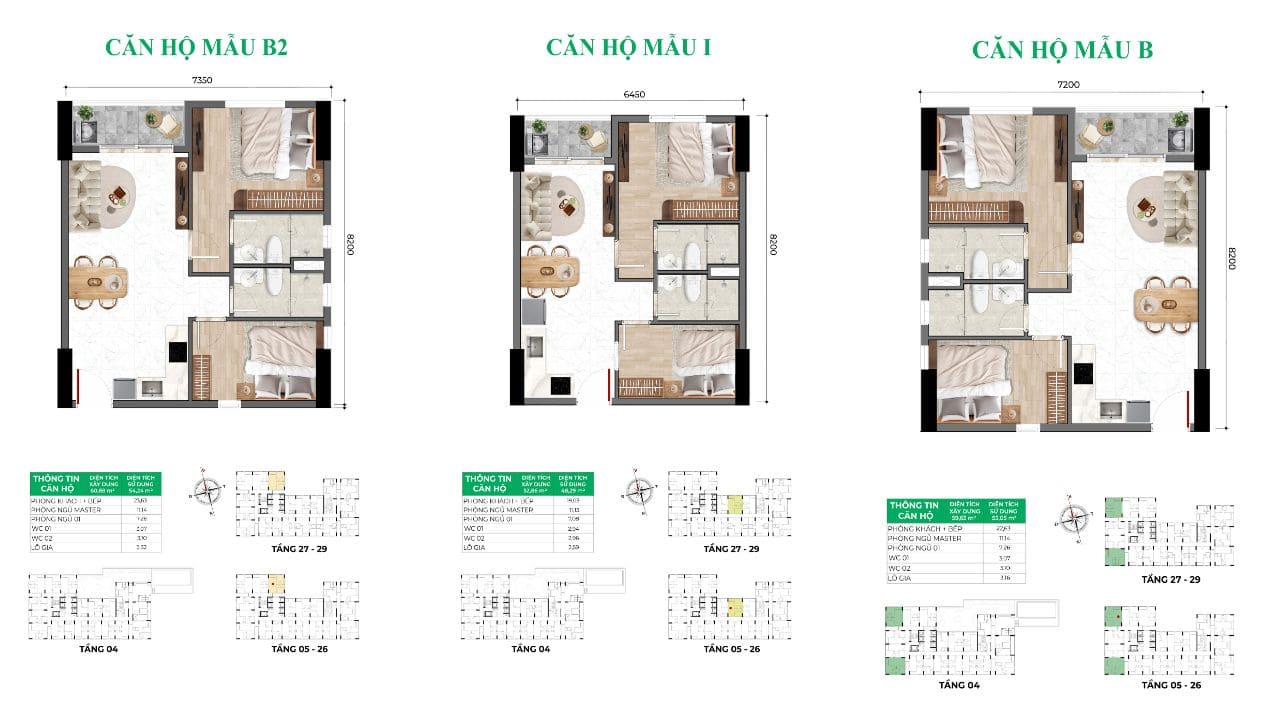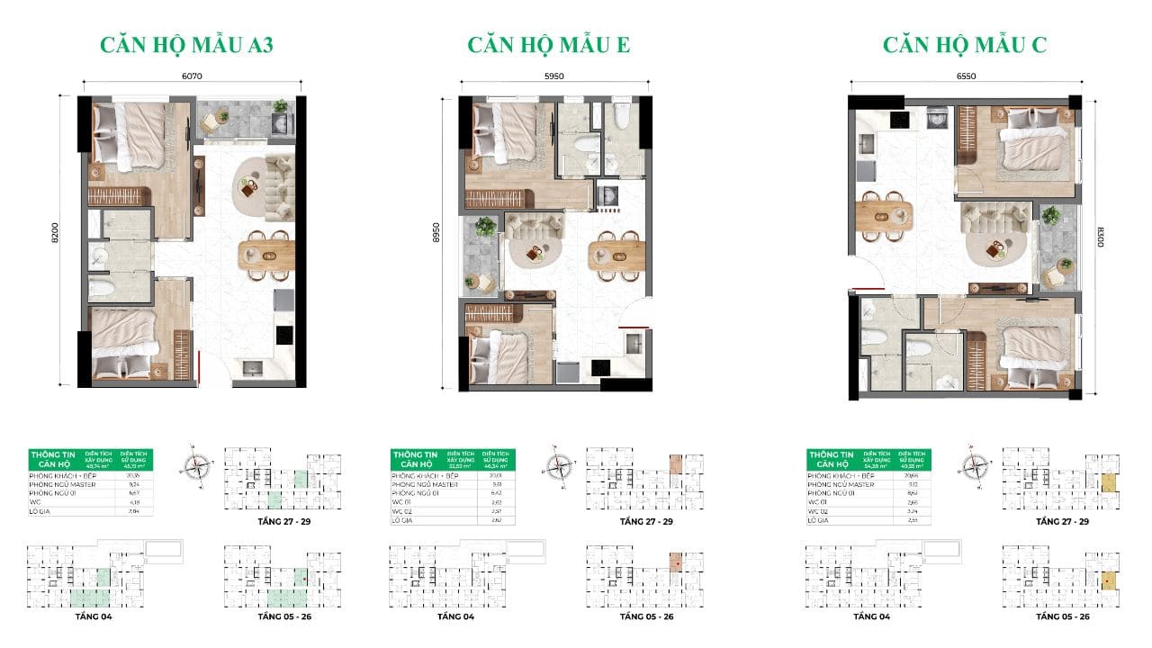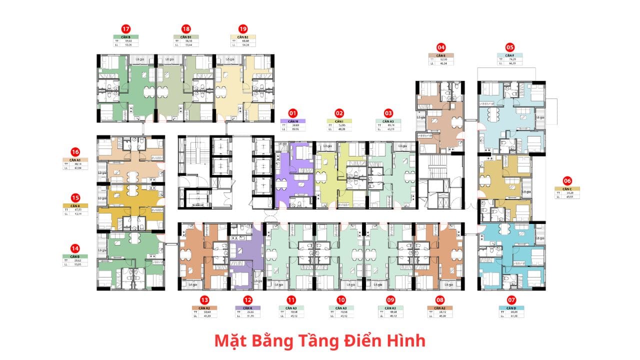 Diện Tích | Căn 1PN 1WC, 2PN 1WC, 2PN 2WC, 3PN 2WC Diện tích từ 35m2 đến 75m2 |