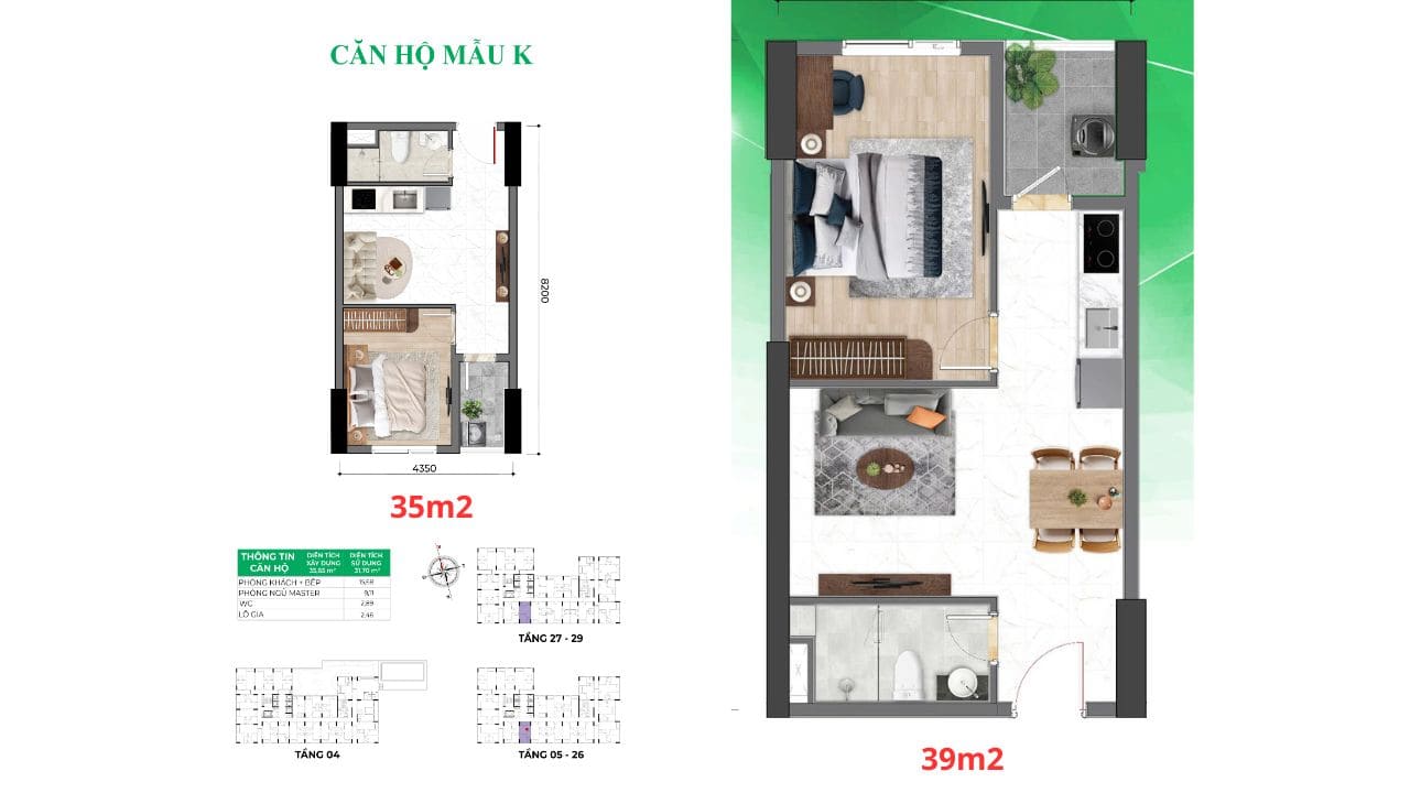 Thiết Kế Căn Hộ Bcons Asahi Căn 1PN:35m2 - 39m2