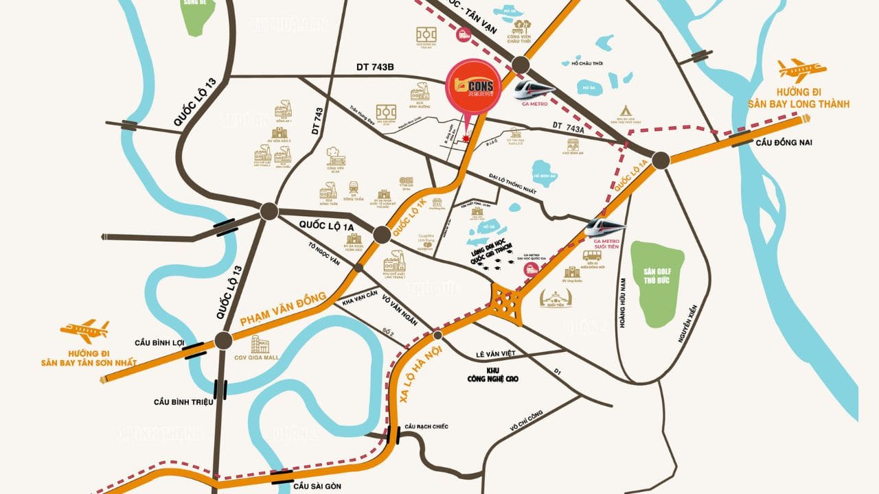 Từ dự án Bcons Asahi có thể dễ dàng di chuyển tới trung tâm Quận 1 bằng Xa Lộ Hà Nội hoặc tuyến Metro.Kết nối với thành phố Biên Hòa bằng QL 1K.Kết nối với Gò Vấp,Bình Thạnh,thành phố Thủ Đức và đăc biệt là sân bay Quốc tế Tân Sơn Nhất bằng Phạm Văn Đồng.