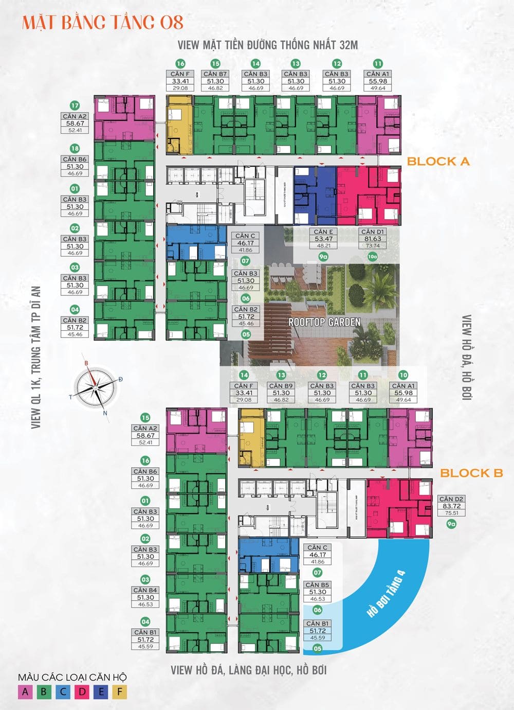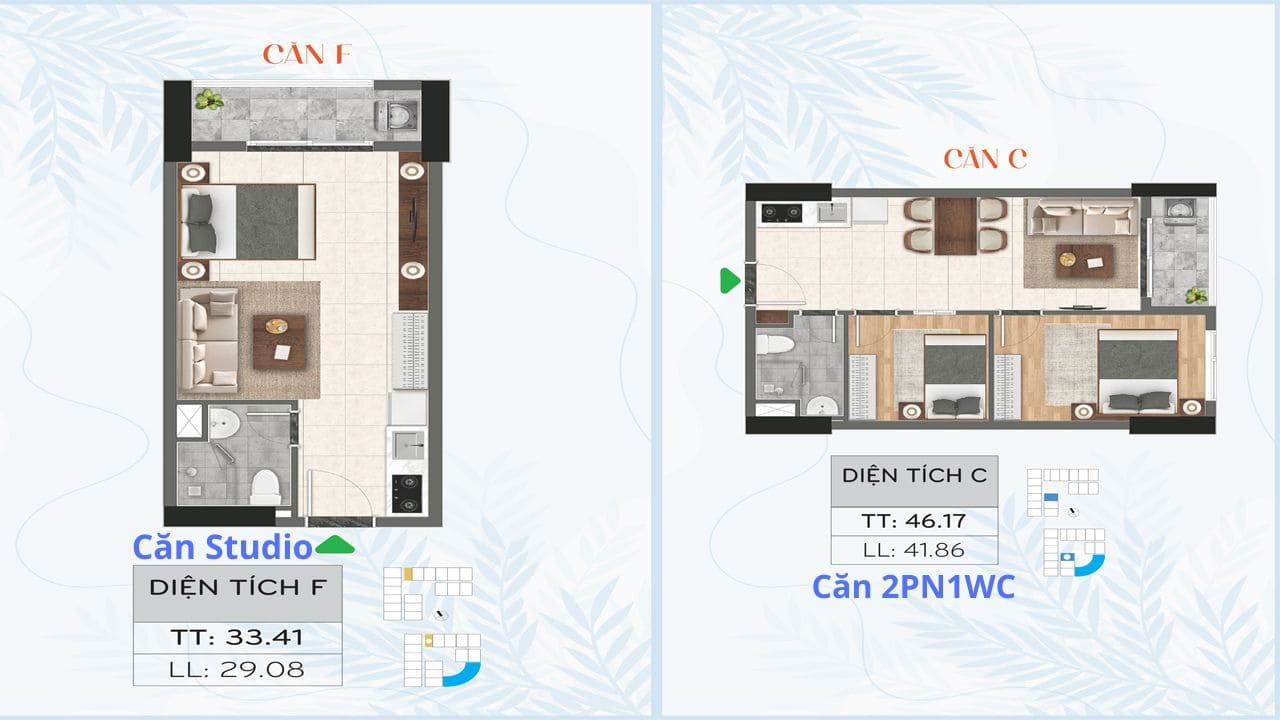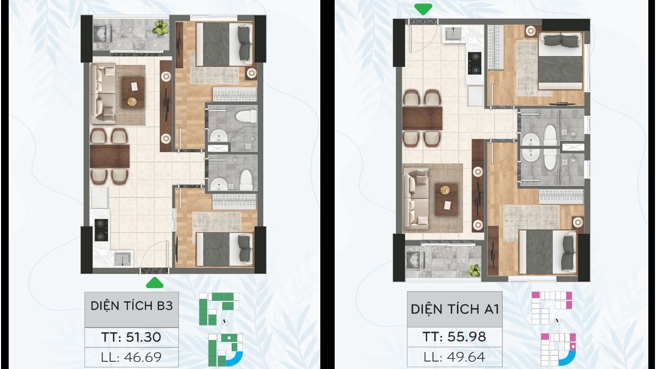 Diện Tích | Căn hộ 1PN 1WC : 33m2,Căn hộ 2PN 1WC : 46m2.Căn hộ 2PN 2WC : 50m2,51m2,53m2,55m2,57m2,58m2,60m2,63m2. Nhà Phố: 60m2 , 70m2 |