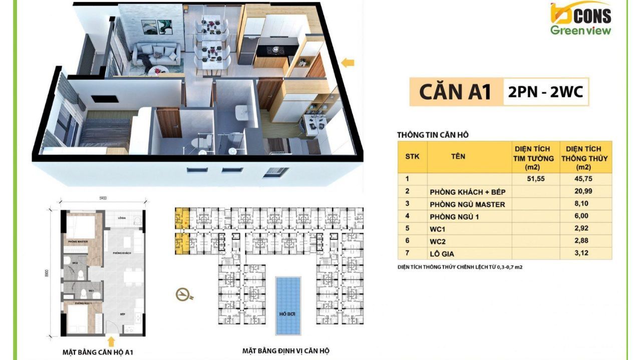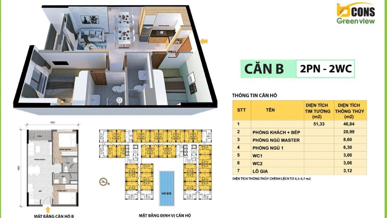 Thiết Kế Căn Hộ Điển Hình Bcons Green View 2PN 2WC : 51m2