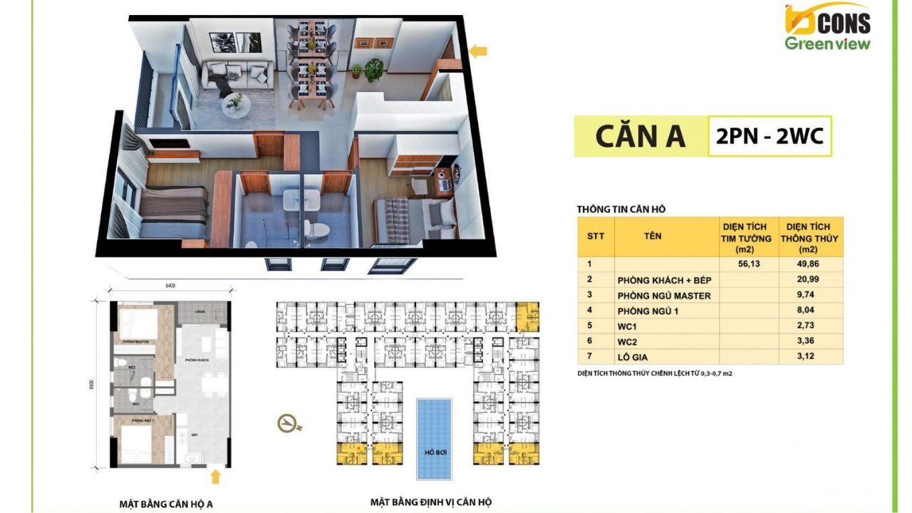 Thiết Kế Căn Hộ Bcons Green View 2PN 2WC : 51m2 56m2