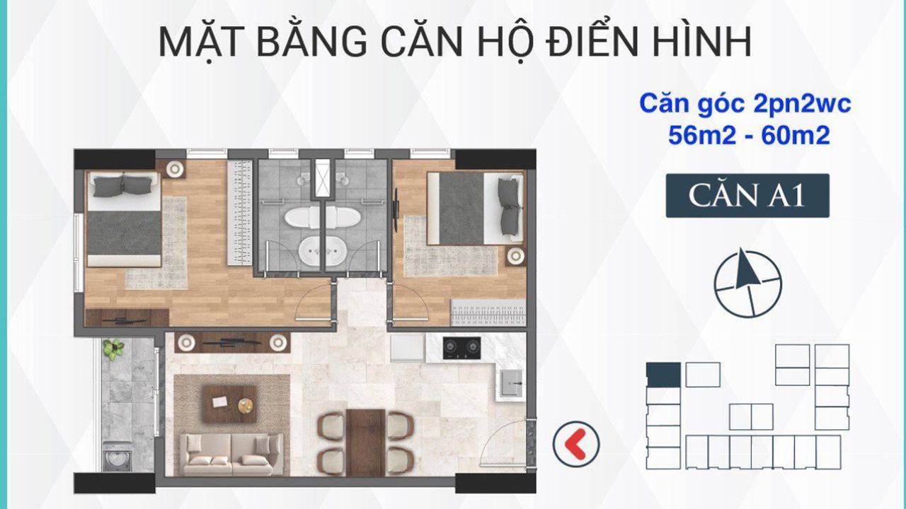 Thiết Kế Căn Hộ Bcons Polaris Căn Góc Mới 2 Phòng Ngủ-2WC: 58m2-60m2